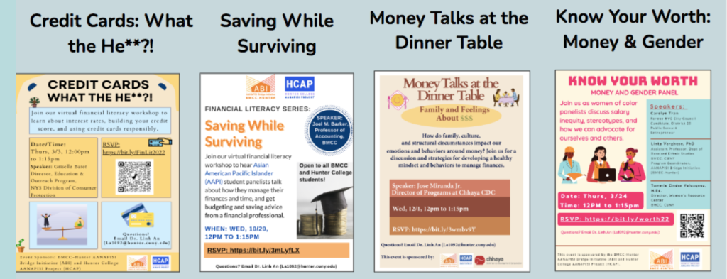 To learn more about upcoming financial literacy workshops, visit: https://huntercap.org/abi-events/ or contact: abi@bmcc.cuny.edu