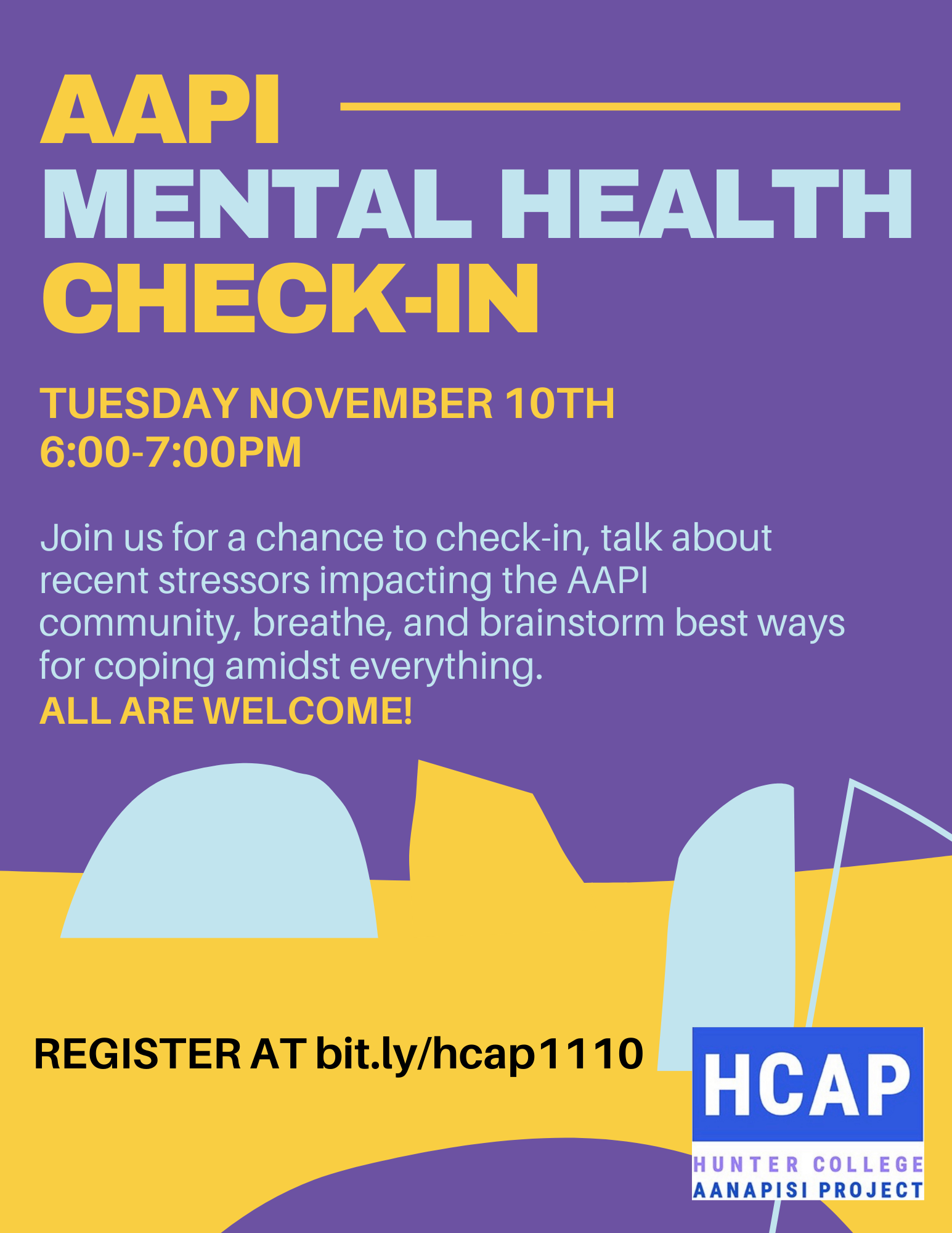 Join us for a chance to check-in, talk about recent stressors impacting the AAPI community, breathe, and brainstorm best ways for coping amidst everything.