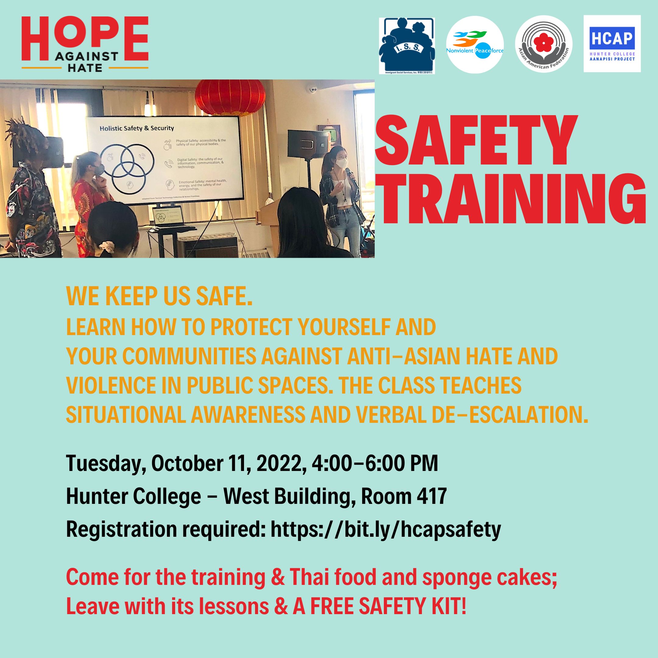 With the increase in hate crimes and violence directed towards our East Asian, South Asian, Southeast Asian, and Pacific Islander communities, many students are experiencing stress when commuting and being in public areas. On Tuesday October 11, join us for an in-person safety training from 4 – 6pm. Learn techniques and skills focused on situational awareness and verbal de-escalation. Stay for a mental health debrief space to discuss experiences and thoughts about training if you’d like (optional).