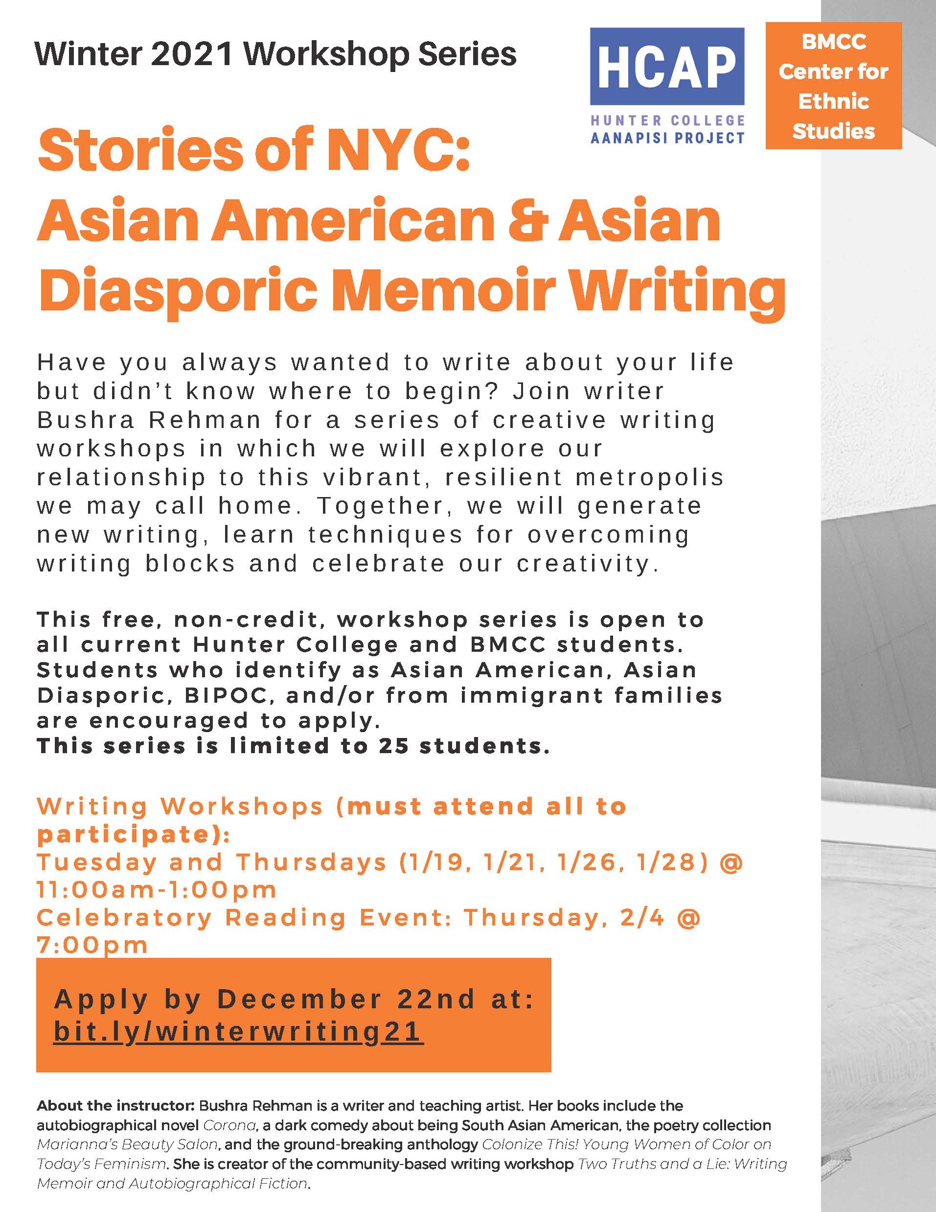 This free, non-credit, workshop series is open to all current Hunter College and BMCC students. Students who identify as Asian American, Asian Diasporic, BIPOC, and/or from immigrant families are encouraged to apply.