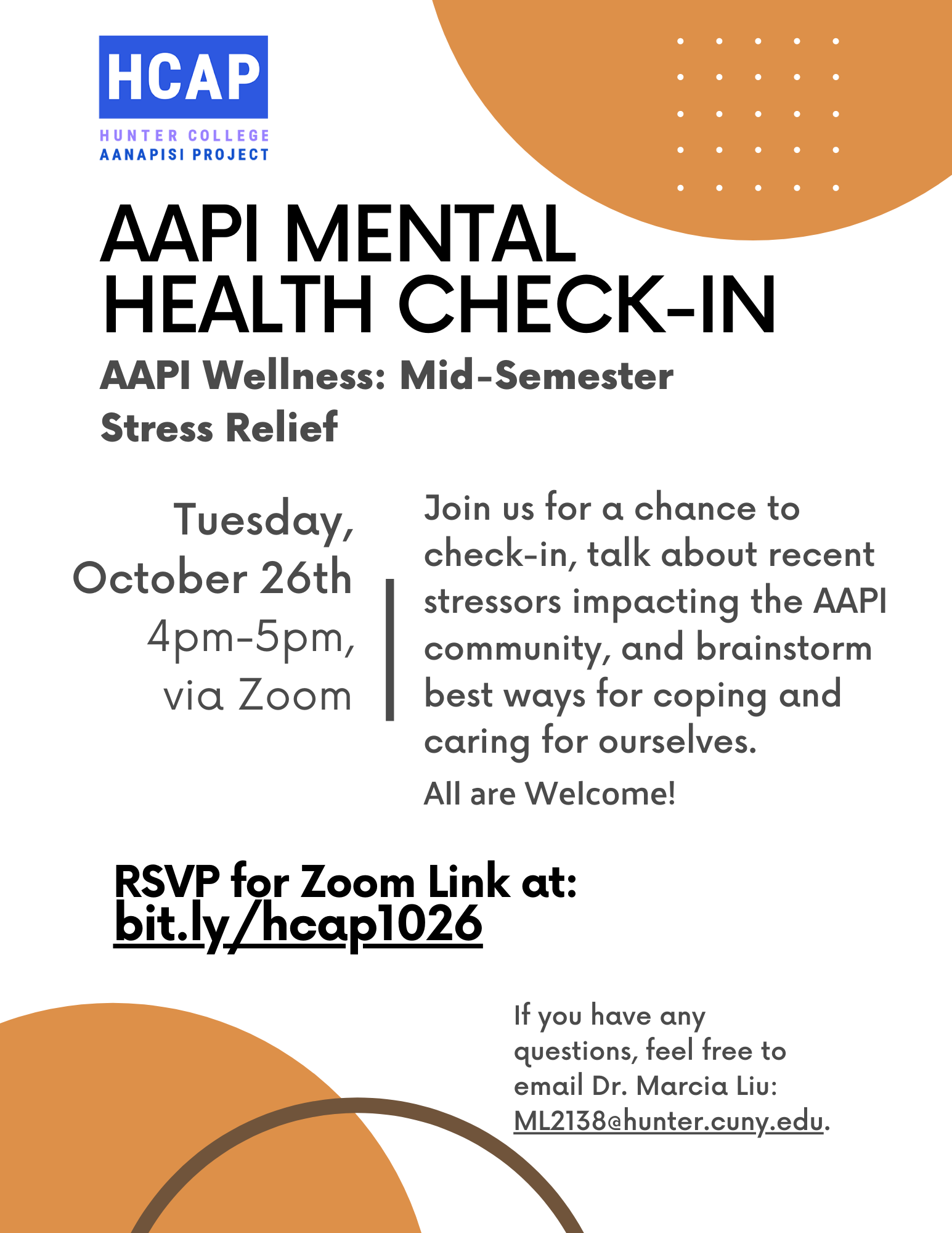 Join us on Zoom on October 26th at 4-5pm for a chance to check-in, talk about recent stressors impacting the AAPI community, and brainstorm best ways for coping and caring for ourselves.