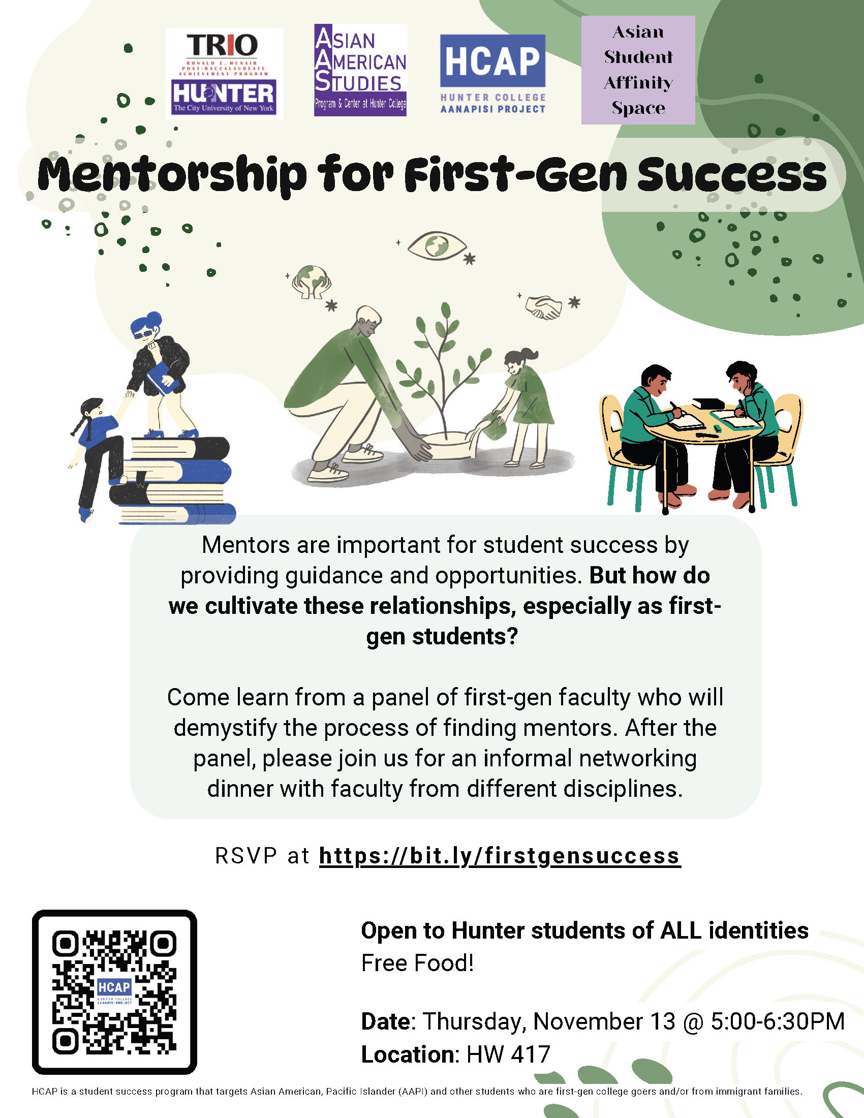 HW 417Do you have questions about life after college? Are you interested in networking with Hunter alumni? In collaboration with the Asian Student Affinity Space, join us for an alumni panel and networking event! Chat with HCAP grads about navigating post-grad life and exploring different career paths. Open to ALL Hunter students. Free food! (We'll have vegetarian/vegan […]