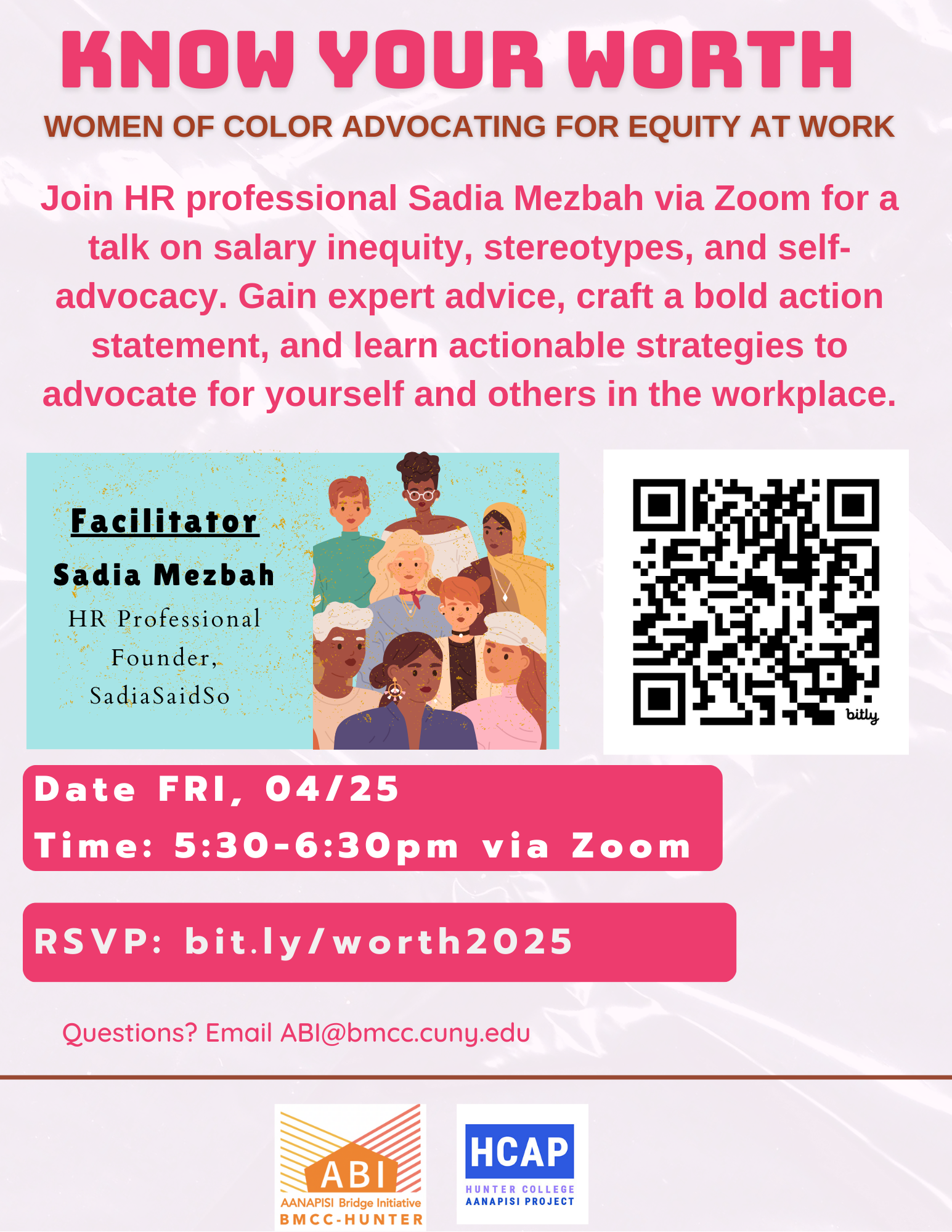 Join HR professional Sadia Mezbah via Zoom for a talk on salary inequity, stereotypes, and self-advocacy. Gain expert advice, craft a bold action statement, and learn actionable strategies to advocate for yourself and others in the workplace. Date/Time: FRI, 4/25, 5:30pm to 6:30pm Location: ZOOM (link will be provided after registration) RSVP HERE: http://bit.ly/worth2025 Facilitator: […]