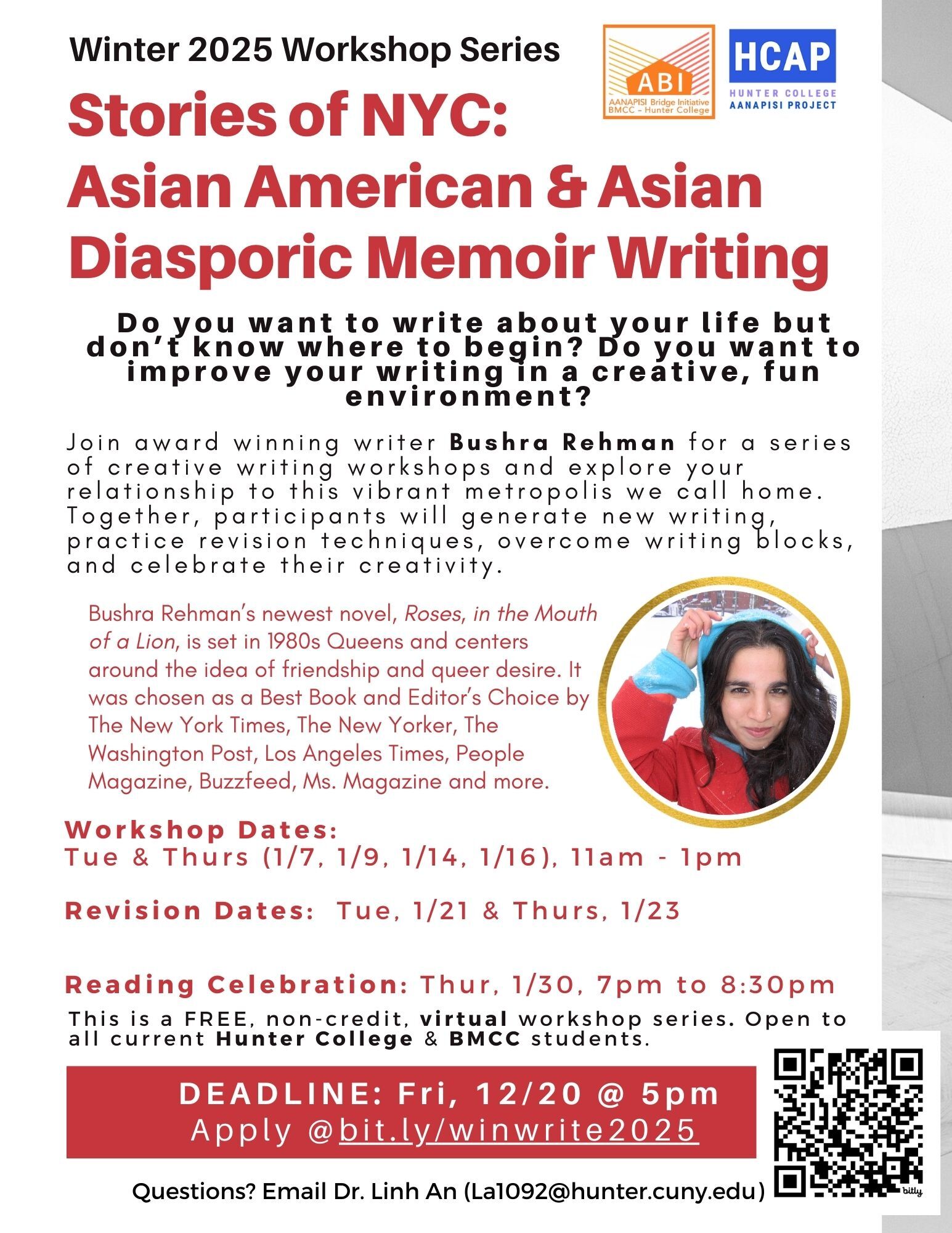 ⭐ Open to ALL current Hunter College and BMCC undergraduate students, regardless of identity and background. ⭐ Do you want to write about your life but don't know where to begin? Do you want to improve your writing in a creative, fun environment? Join award winning writer Bushra Rehman (Roses, In the Mouth of a Lion) for […]