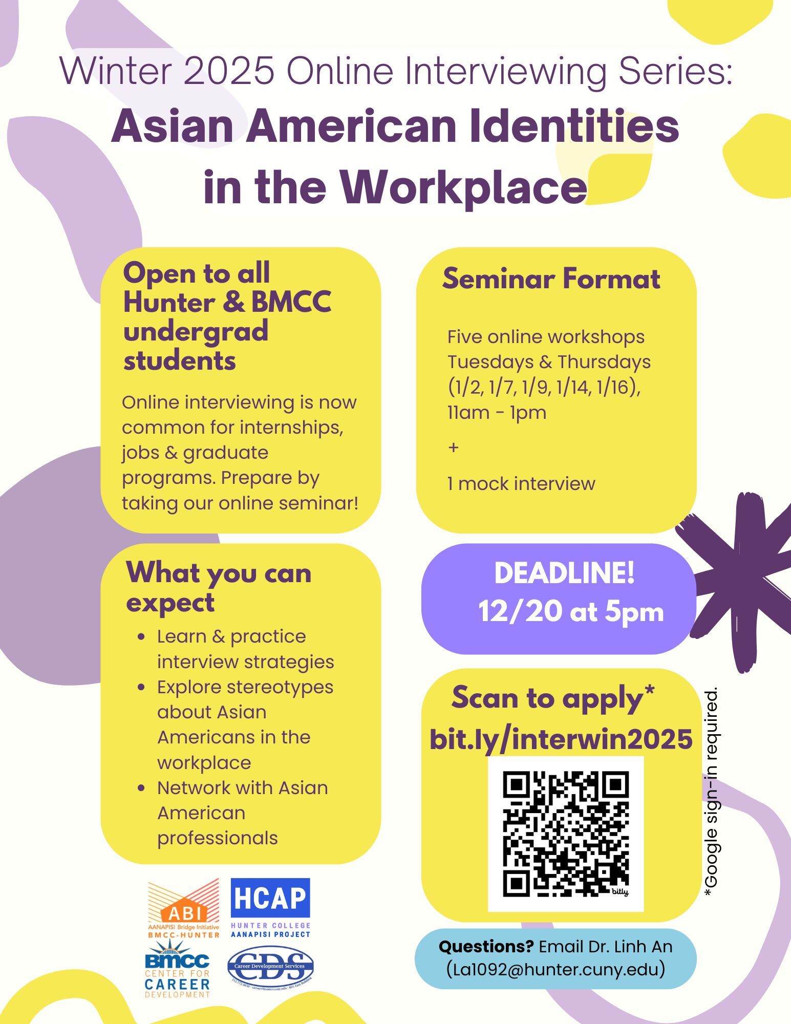 ⭐ This program is open to ALL Hunter and BMCC students, regardless of identity or background. ⭐ FREE winter seminar: Online Interviewing: Asian American Identities in the Workplace COURSE DESCRIPTION Online interviewing is an increasingly common practice for jobs, internships, and admissions to graduate/professional programs. In this online series, students will explore stereotypes about Asian Americans in the […]